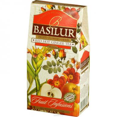 Basilur Fruit Infusions Red Hot Ginger Tea – оригинальный черный чай с кусочками имбиря, папайи, яблока и шиповника, апельсиновой цедрой, цветками гибискуса, а также ненавязчивым имбирным ароматом. Экономная упаковка сделана из картона, а сам чай упакован в надежный воздухонепроницаемый пакет с зип-локом.