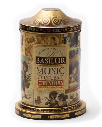 Basilur Music Concert Christmas ("Рождественская музыкальная шкатулка") — чёрный цейлонский байховый крупнолистовой чай. Создан экспертами Basilur специально для незабываемой рождественской атмосферы. Новогоднее настроение обеспечивают кусочки имбиря, яблока, лимона и ананаса, лепестки василька и голубой мальвы, натуральные ароматы корицы и ванили. Цвет напитка получается тёмно-коричневый, с дубовыми и рубиновыми оттенками.