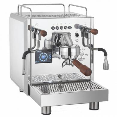 Модель Bezzera DUO представляет собой сложную, но компактную полупрофессиональную кофемашину эспрессо. Цветной сенсорный цисплей позволяет программировать термосистемы двух бойлеров и время пролива эспрессо. Паровая трубка с шарнирным соединением и аэратор горячей воды управляются кранами с ручками из ценного дерева; латунный хромированный портафильтр тоже с деревянной ручкой — используется палисандр.