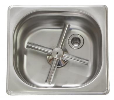 Ополаскиватель сокращает время очистки рабочей посуды вдвое. В центре крестовины находится отверстие подачи воды под давлением. Питчером, стаканом, чашкой, коктейльным шейкером нажимают на крестовину, через форсунку подается сильная струя прохладной воды, которая эффективно очищает посуду от загрязнения. Вам не нужно использовать дополнительные моющие средства. Ринзер встраивается в столешницу, что достаточно удобно и практично. Его легко подключить к водопроводу и канализации.
