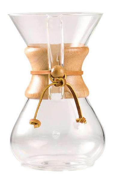 Кофеварка Кемекс — элегантная, сделанная в форме песочных часов из высококачественного баросиликатного термостойкого стекла. Модель оформлена манжетой из полированного дуба, обвязанного кожаным шнурком. Ободок служит изолированной ручкой посередине колбы.
