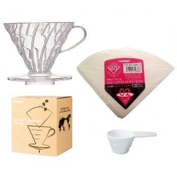 Сет Харио Ви-60 Клир Коффи Дриппер виз Фильтерс включает в себя прозрачный пластиковый пуровер «02», пластиковую мерную ложку и набор белых бумажных фильтров размера «02».