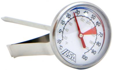 Температуры на циферблате указаны в градусах по Цельсию (°C) и Фаренгейту (°F); диапазон температур, измеряемых термометром Ilsa — -10°-100°C ( 20°-200°F). Поле между 60°C и 70°C для наглядности окрашено в красный цвет. Для максимально удобного использования термометр Илса оснащен специальной прищепкой, с помощью которой его удобно прикреплять к питчеру во время вспенивания молока.