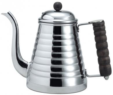 Носик чайника имеет специальную форму, называемую «Шея лебедя». Благодаря узости, длине и плавному изгибу, пользователь имеет возможность максимально контролировать выливаемую стуйку воды, напор и место её попадания в воронку с молотым кофе. Резная деревянная ручка очень удобна, приятно сидит в руке.