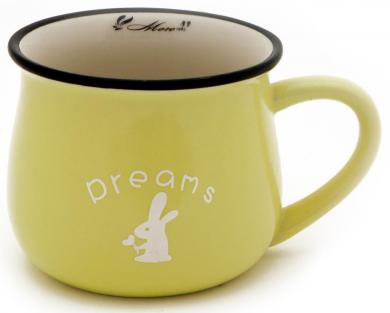 Желтая чашка оформлена надписью «Dreams», что означает «мечты» или «сны», под надписью — изображение зайца.